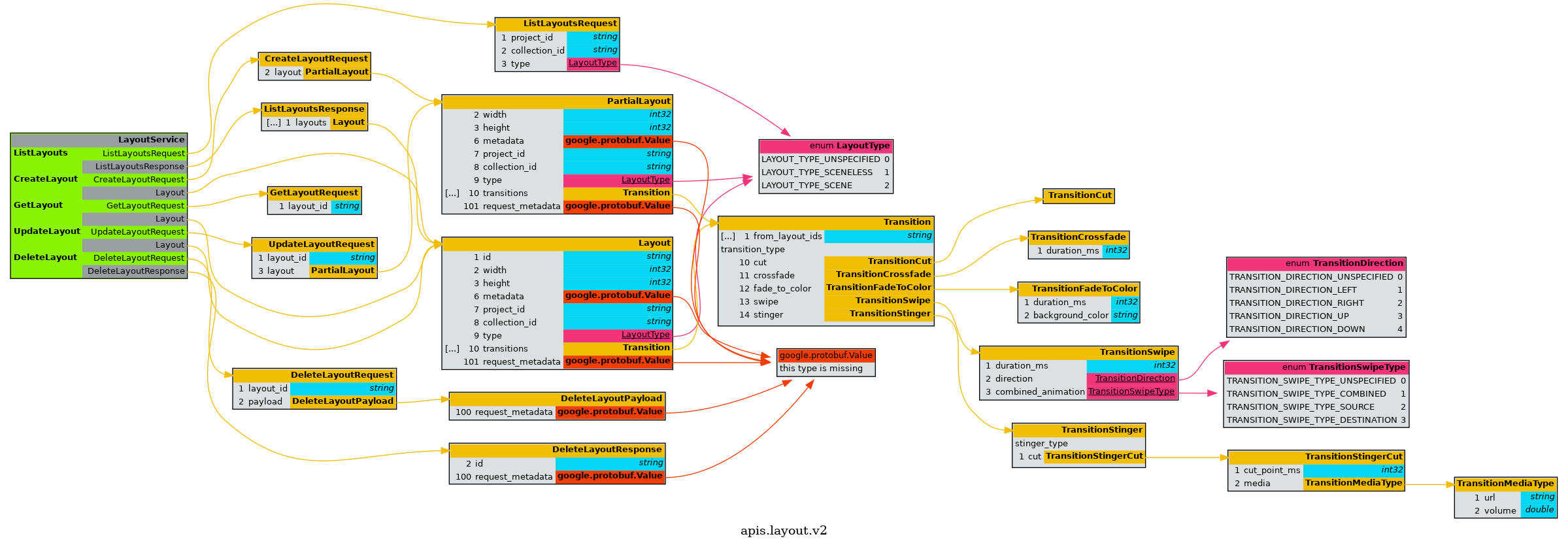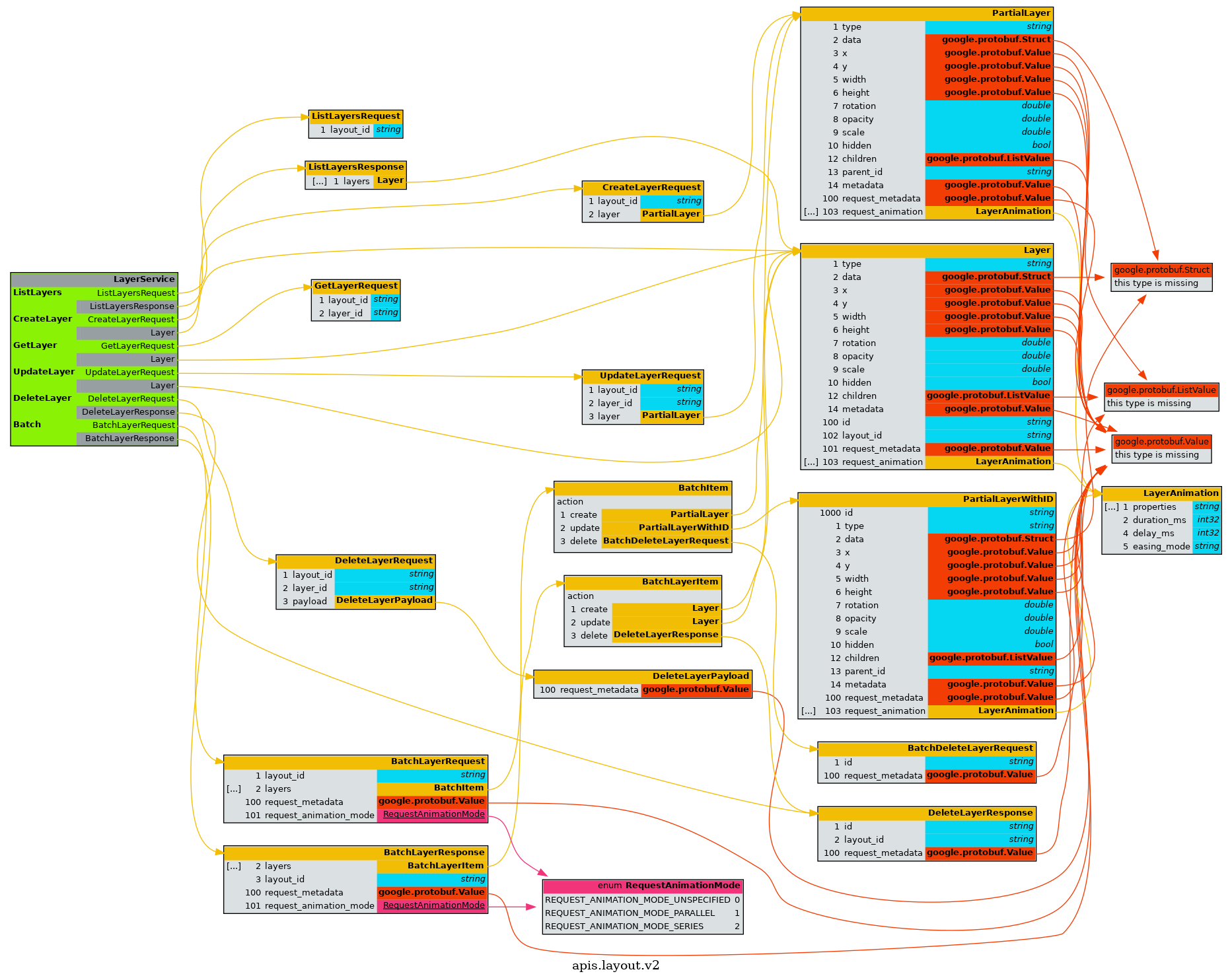 The following diagram visualizes the relationships of data types used in the Layout API. It is intended to be used as a reference to developers alongside the API docs.